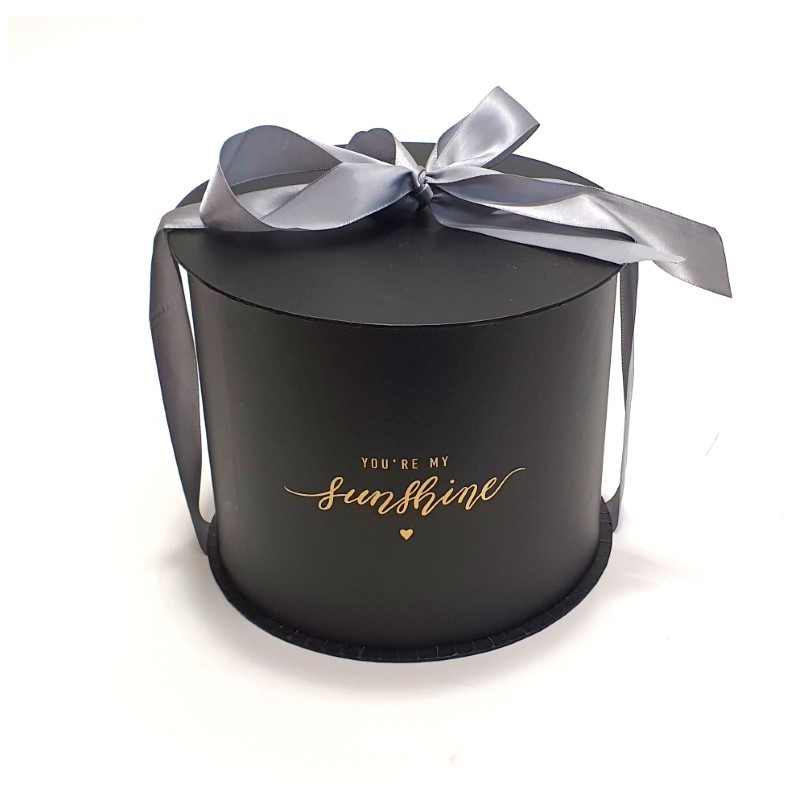Dėžutė dovanoms popierinė apvali, juodos spalvos. Matmenys: skersmuo - 21cm, aukštis - 20cm.
