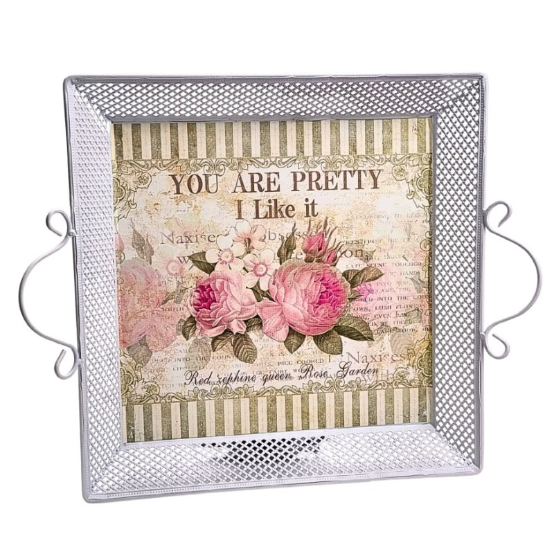 Padėklas metalinis gėlės tinklelis baltas. Matmenys: 29*29cm, aukštis - 5cm.