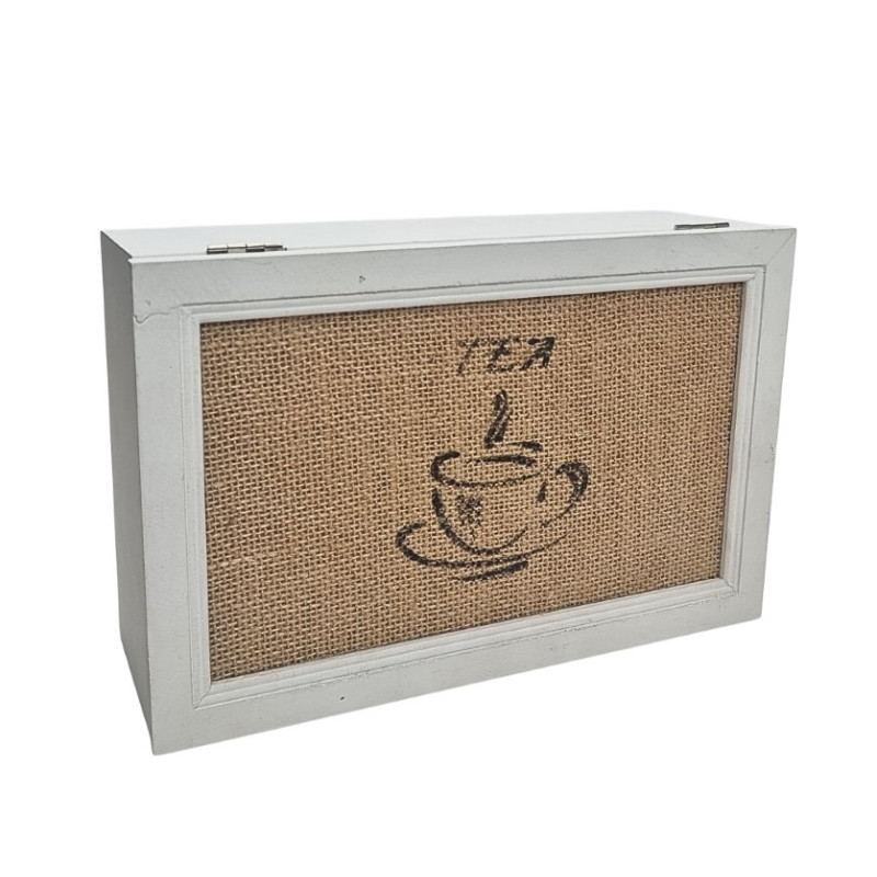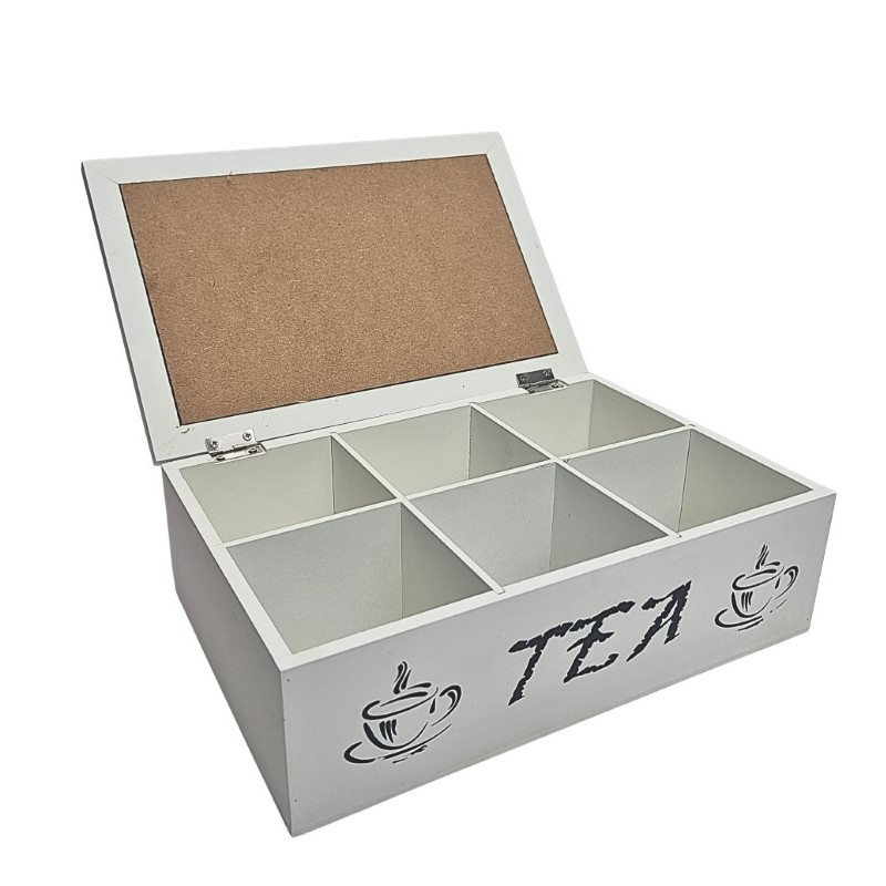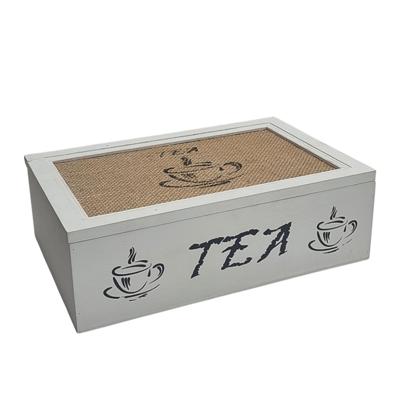 Dėžutė arbatai, medinė. Puodelių paveikslėliai, TEA užrašas. 6skyriai. 25*16cm, Aukštis- 8cm.
