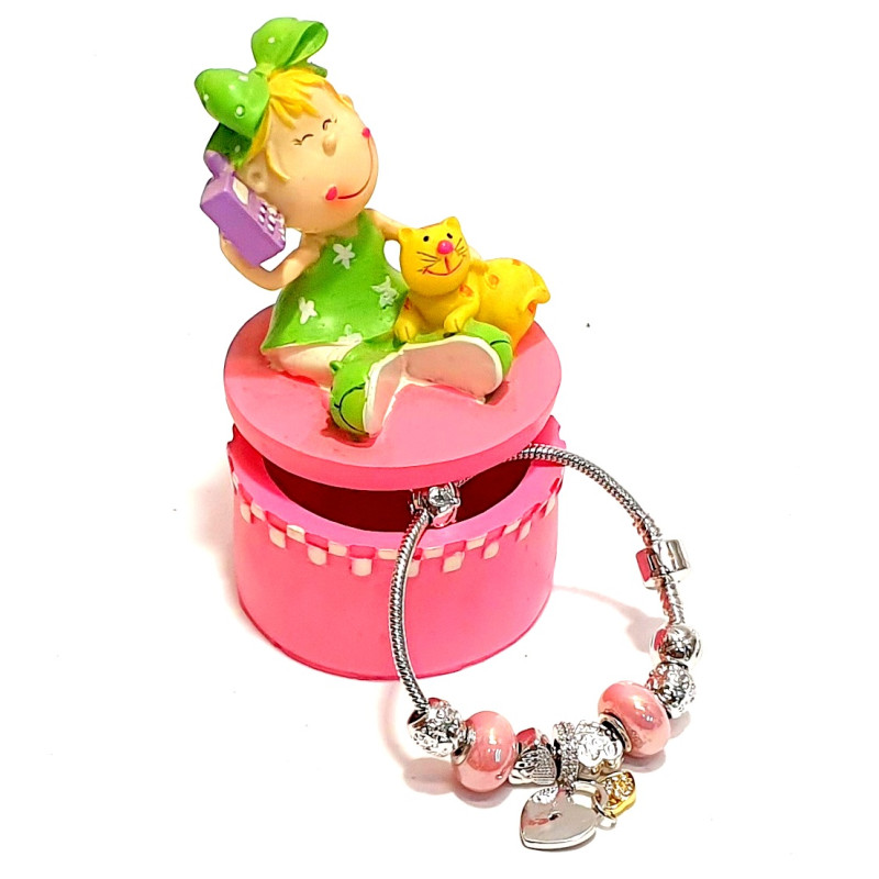 Kartoninė stačiakampė papuošalų dėžutė, vilkta aksomu, švelnios rožinės spalvos, iš priekio aukso spalvos apskritimas, viduje skyriukai. Matmenys: 26.5*13.5cm, aukštis - 9.7cm.