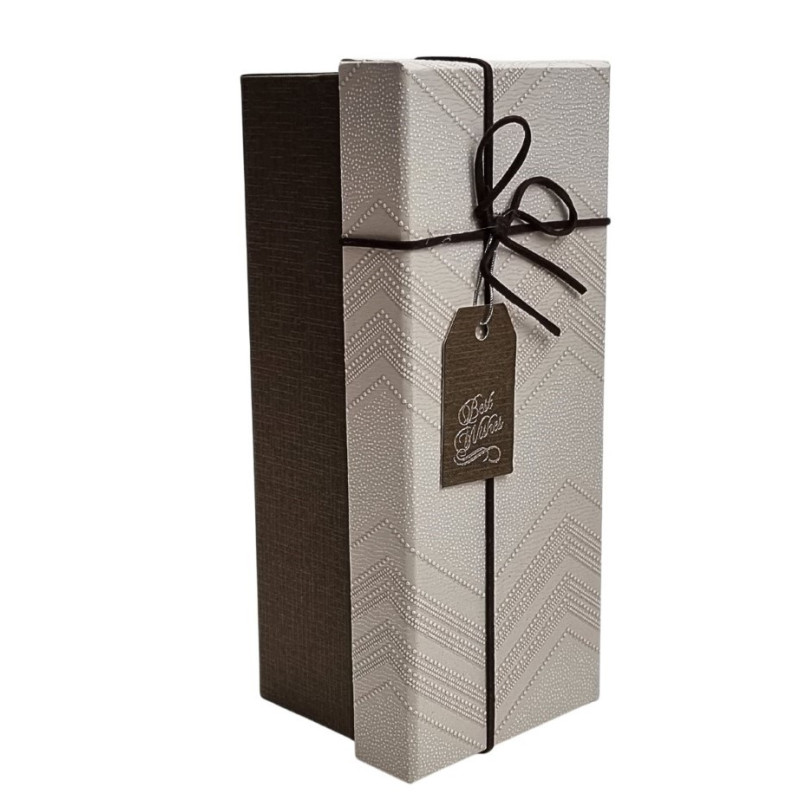Kalėdinė dėžutė buteliui popierinė, virvelės, auksiniai - juodi kalėdiniai motyvai baltame fone. Du skirtingi piešiniai. Pirkimo metu komentare nurodykite, kurio piešinio pageidaujate. D10cm, H34.5cm.