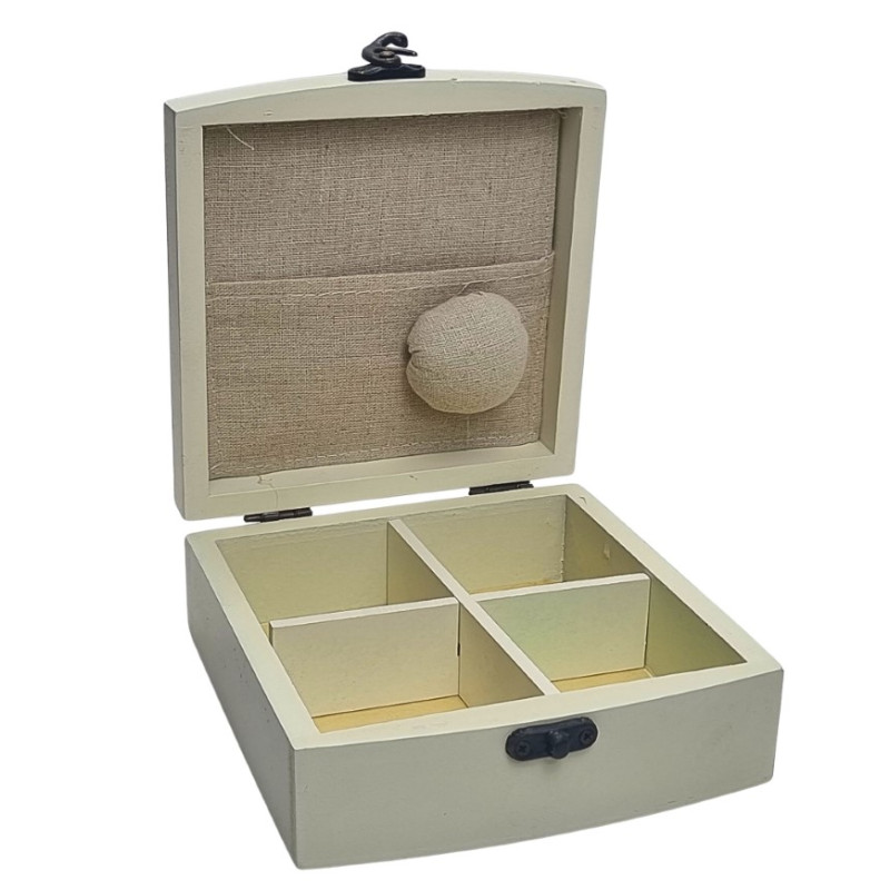 Medinė dėžutė siuvimo reikmenims, viduje 4 skyreliai. Matmenys: 15*14.5cm, aukštis - 6.5cm.