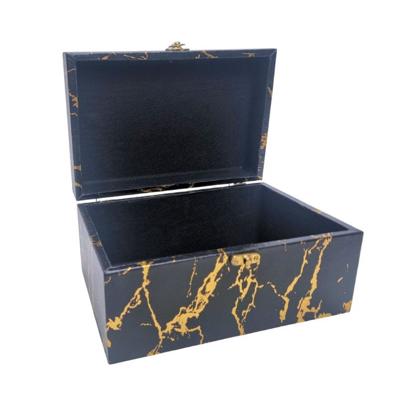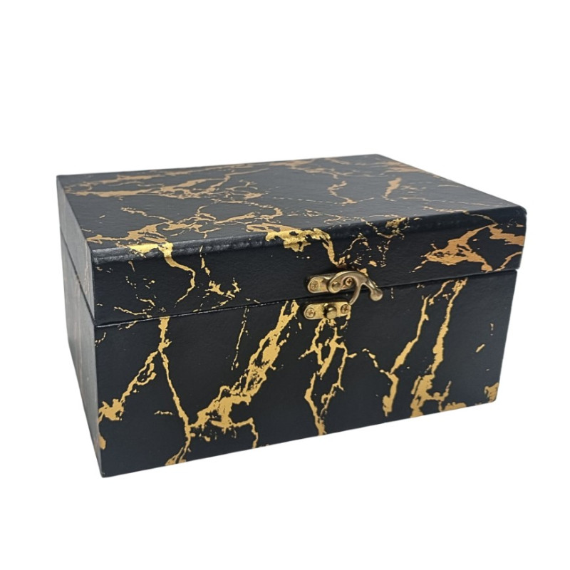 Medinė dėžutė Garden su užsegimu, MDF, vidus išklotas juodu audiniu. Juodos ir aukso spalvos marmuro raštas. Matmenys: 24*16cm, aukštis - 12cm.