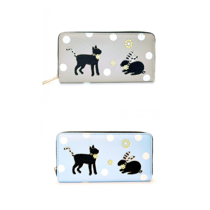 Piniginė moteriška užsegama užtrauktuku. Raštas: taškeliai ir gyvūnai. 2 spalvos. (10x19 cm)