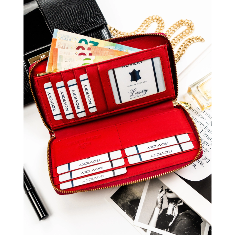 Odinė moteriška piniginė Rovicky RFID, užsegama ilgu užtrauktuku. Viduje užtrauktukas monetoms, juodos spalvos, matinė. Matmenys: 19*10*2.5cm.