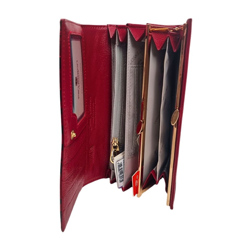 Moteriška, lakuota piniginė , pagaminta iš natūralios odos su RFID apsauga. Raudonos spalvos.