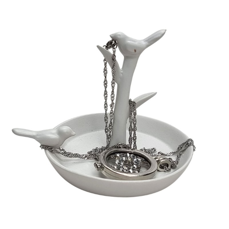 Keraminė lėkštutė papuošalams su 2 paukštukais, baltos spalvos. Matmenys: skersmuo - 9.5cm, aukštis - 8.5cm.