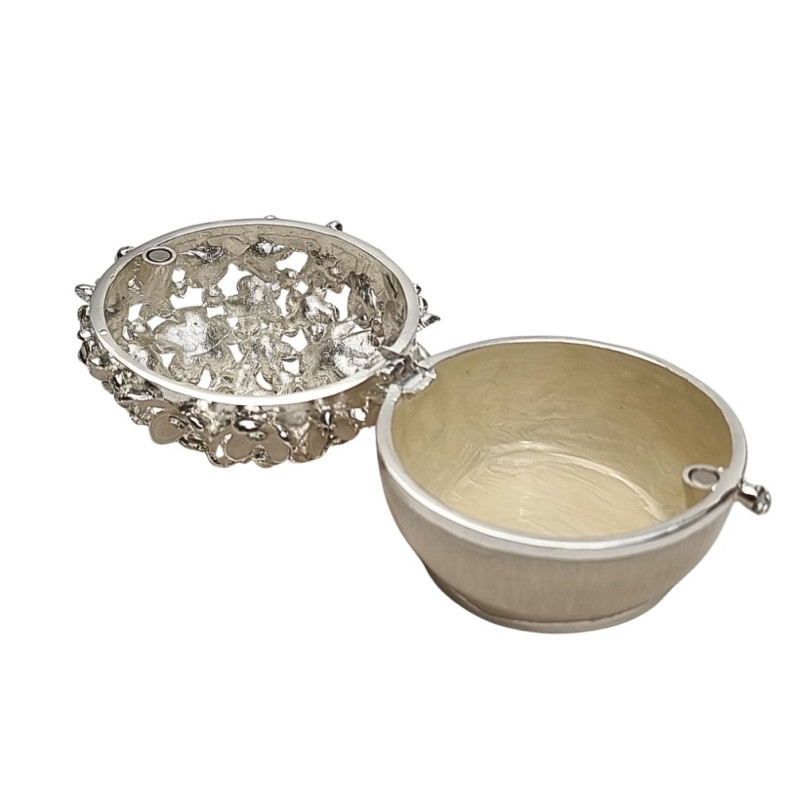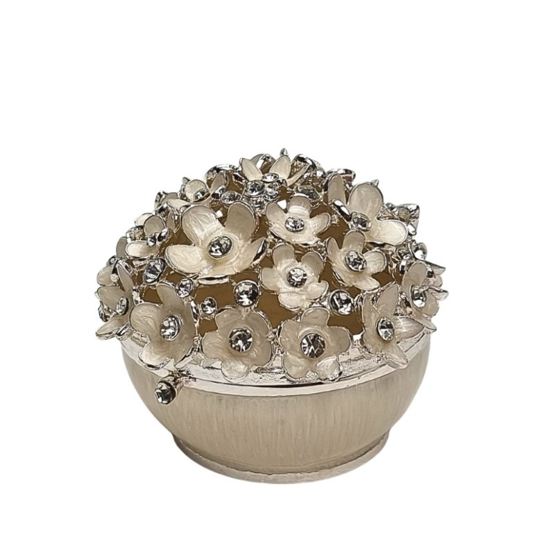 Metalinė, tvirta papuošalų dėžutė. Pagaminta iš plieno, padengta perlo baltumo perlamutro spalva. Viršus dekoruotas gėlių žiedeliais ir kristaliukais. Matmenys: skersmuo - 7.5cm, aukštis - 6.5cm.