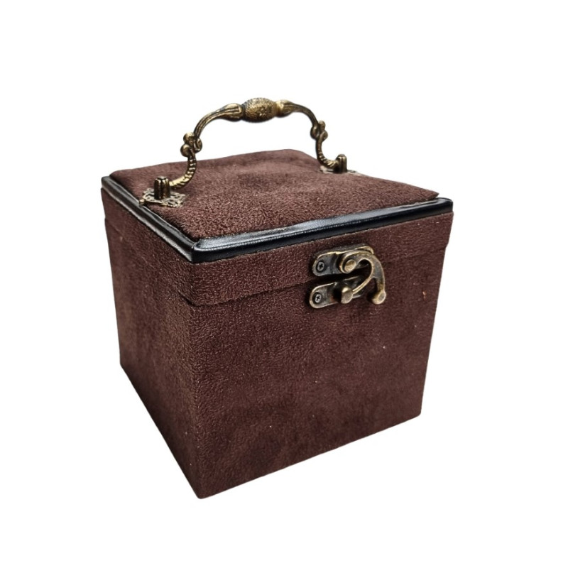 Dėžutė dengta audiniu kvadratinė rankena veidrodis. 12x11 cm.