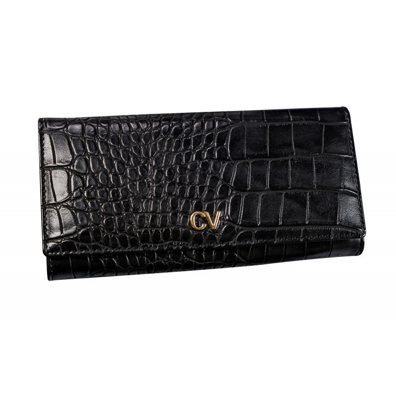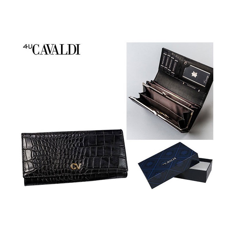 Piniginė moteriška odinė Cavaldi užsegama 4 skyriai gyvatės odos raštai juoda. 18.5*10 cm.
