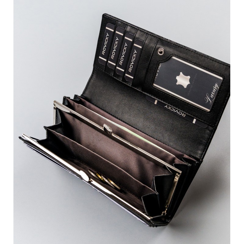 Didelė, juoda vyriška piniginė, pagaminta iš natūralios odos. Vertikalaus dizaino, be užsegimo. Turi skyrelį pinigams, užtrauktuku užsegamą skyrelį ir 13 kortelių bei asmens tapatybės kortelių skyrelių. Piniginėje taip pat telpa transporto priemonės registracijos liudijimas. Pridedama dovanų dėžutė. RFID STOP apsauga.