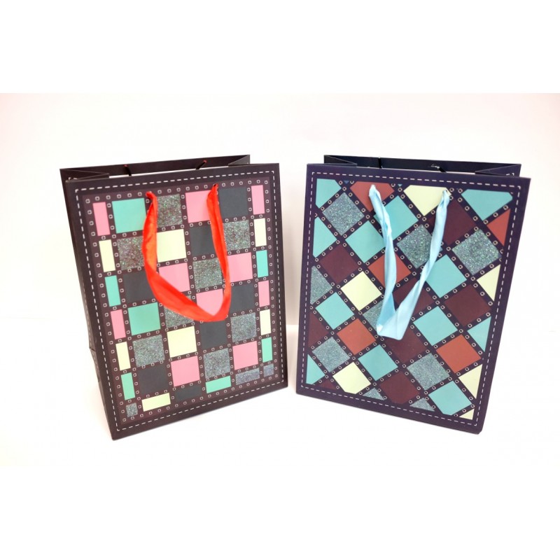 Maišelis dovanoms, eko popierius, trikampiai. 4 spalvos. Matmenys: 32*24*11 cm.