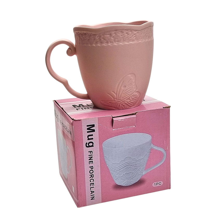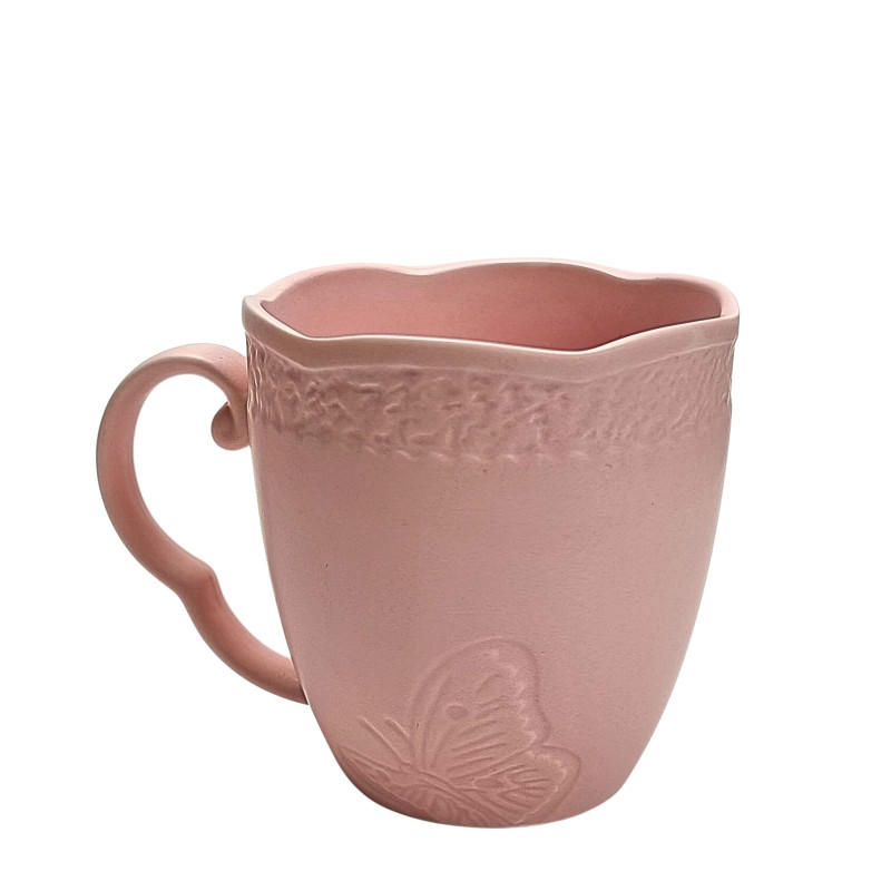 Keraminis puodelis, švelniai rožinės spalvos, banguoti kraštai, dekoruotas reljefiniu drugeliu. Matmenys: skersmuo - 8.5cm, aukštis 8.5cm.