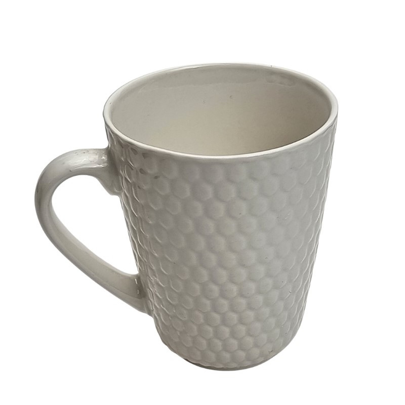 Keraminis puodelis, išgaubtas, baltas kačiukas, 1 akytė su juoda dėme, puodelio viršuje - ausytės. Matmenys: talpa - 380ml, skersmuo - 10cm, aukštis - 8.5cm.