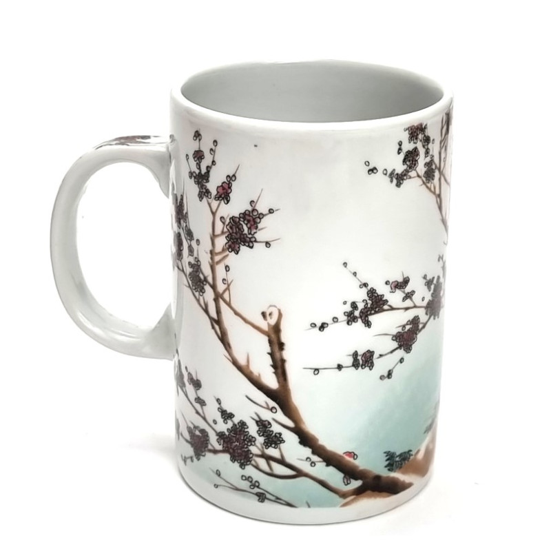 Porcelianinis puodelis Duo Christmas Birds, dekoruotas sniegenomis ant pušies šakelių. Matmenys: talpa - 350ml, skersmuo - 8.2cm, aukštis - 10.3cm.