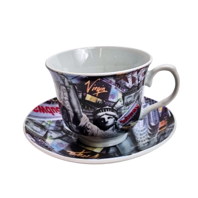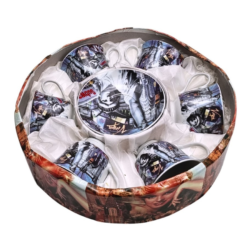 Rinkinys pagamintas iš aukščiausios kokybės kaulinio porceliano – tobulas baltumas, didelis stiprumas ir mažas svoris. Gaminys dekoruotas abstrakčiojo meno pradininko Wassily Kandinsky paveikslo „Transverse Line“ (1923m.) motyvu. Rinkinys supakuotas dovanų dėžutėje. Rinkinys iš Carmani kolekcijos. Matmenys: 250ml talpos, puodelio viršaus diametras 7cm, aukštis 7,5cm. Lėkštės skersmuo: 15 cm.