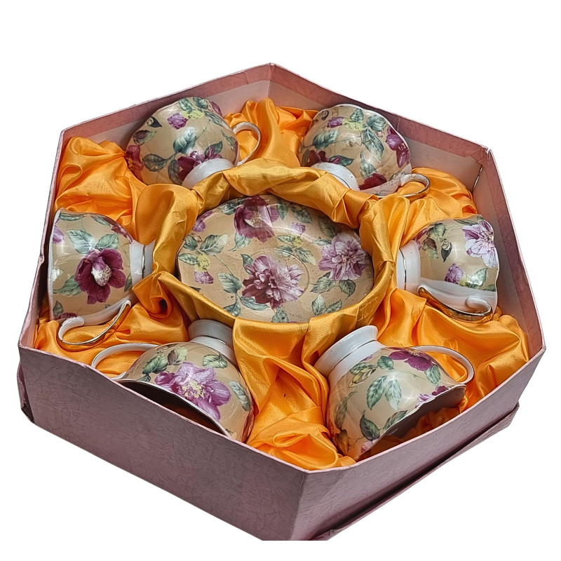 Porcelianinis 6 asmenų puodelių su kvadratine lėkštute rinkinys Yamasen STA-06 iš "24 Gold Collection". Matmenys: 250ml talpos, puodelio skersmuo - 8.7cm, aukštis - 7cm, lėkštutės - 14.5*14.5cm. Tinka naudoti mikrobangų krosnelėje ir indaplovėje.