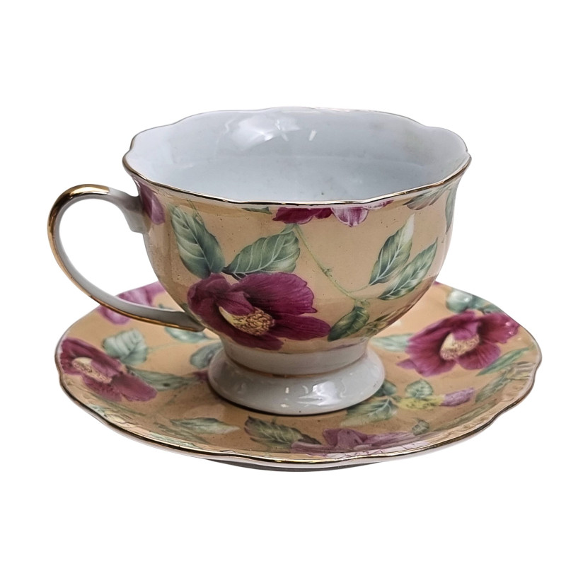Porcelianinis 6 asmenų puodelių su lėkštute rinkinys Yamasen iš "24 Gold Collection". Matmenys: 220ml talpos, puodelio skersmuo - 8.5cm, aukštis - 8cm, lėkštutės skersmuo - 14cm. Tinka naudoti mikrobangų krosnelėje ir indaplovėje.