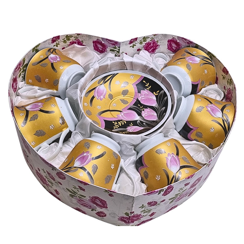 6 asmenų puodelių su lėkštute rinkinys. Matmenys: 250ml talpos, puodelio viršaus diametras 9.5cm, aukštis 7.5cm, lėkštutės skersmuo 13.5cm.