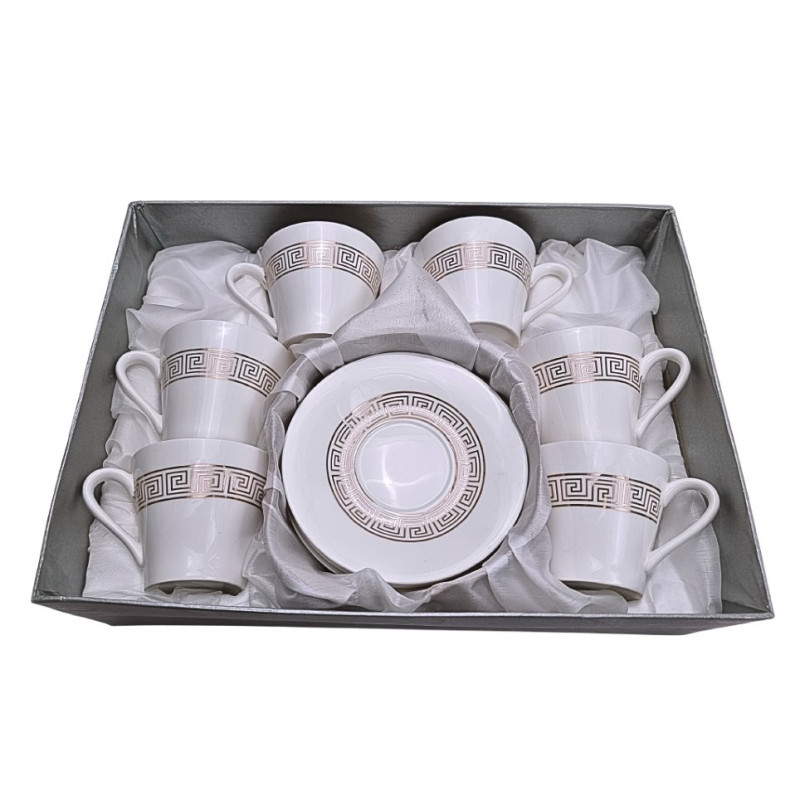Porcelianinis 6 asmenų puodelių su lėkštute rinkinys Veroni Sarah. Puodelio viršus dekoruotas šampanine spalva, baltomis reljefinėmis šakelėmis ir aukso spalvos linija. Matmenys: 220ml talpos, puodelio viršaus diametras - 9cm, aukštis 6.5cm. Lėkštutės skersmuo - 15cm.