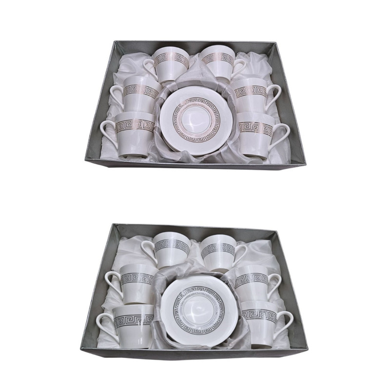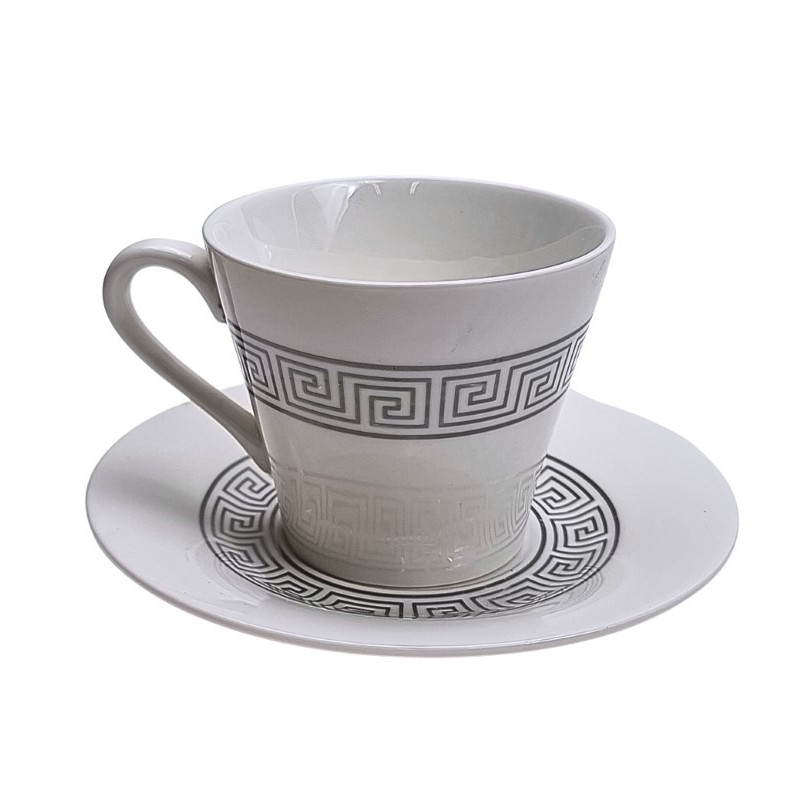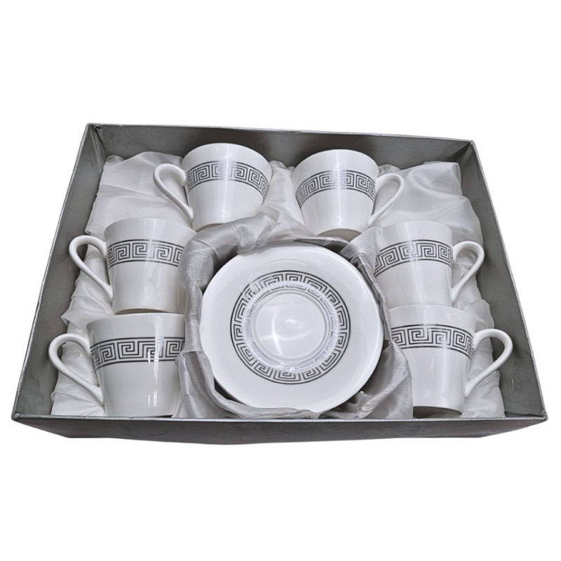 Porcelianinis 6 asmenų puodelių su lėkštute rinkinys Veroni Ronia. Puodelio viršus dekoruotas pilka spalva ir sidabro spalvos linija, lėkštutė ažūrinė. Matmenys: 250ml talpos, puodelio viršaus diametras - 9.2cm, aukštis 7.5cm. Lėkštutės skersmuo - 14cm.