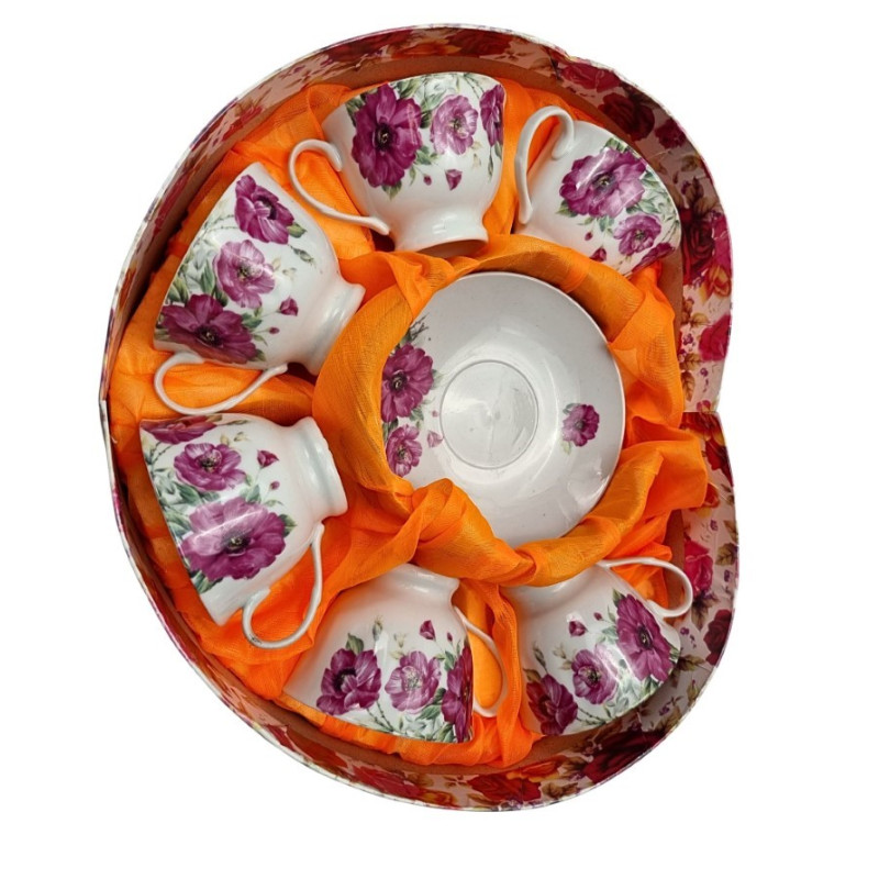 Rinkinys puodelis su lėkštute 6 asm raštai. Aukštis- 7cm.