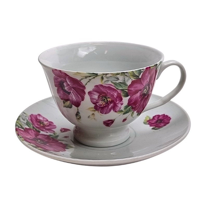 Porcelianinis 2 asmenų puodelių su lėkštute rinkinys Yamasen. Baltos spalvos su gėlių dekoracija. Matmenys: 240ml talpos, puodelio viršaus diametras - 9cm, ilgis su ąsele - 11.2cm, aukštis 7.5cm. Lėkštutės skersmuo - 13.7cm.