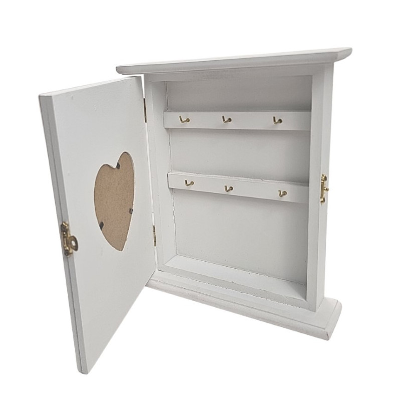 Medinė raktinė, dekoruota baltais lapais, viduje 6 kabliukai. Matmenys: 21.5*6.5cm, aukštis - 26.5cm.