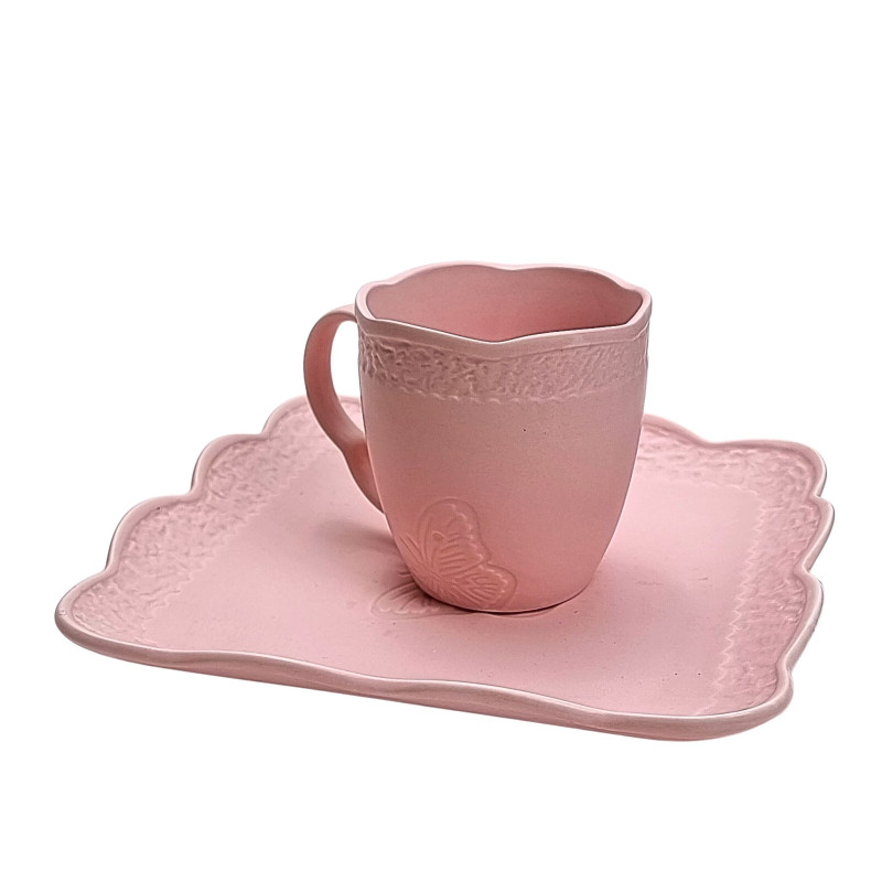 Keraminis puodelis, švelniai rožinės spalvos, banguoti kraštai, dekoruotas reljefiniu drugeliu. Matmenys: skersmuo - 8.5cm, aukštis 8.5cm.
