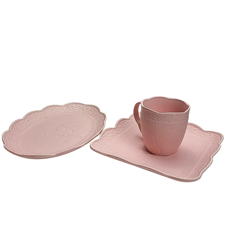 Keraminė lėkštė padėkliukas, švelniai rožinės spalvos, ovalo formos, banguoti kraštai, dekoruota reljefiniu drugeliu. Matmenys: 25*17cm.