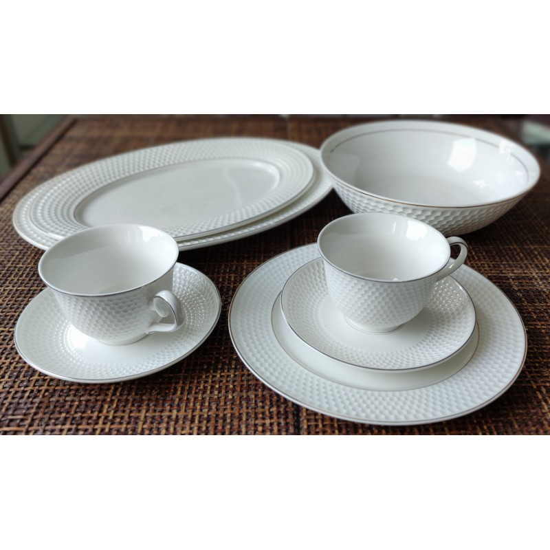 Ovali lėkštė, korio raštas, paauksuoti krašteliai, dramblio kaulo spalva, keramika. Matmenys 26*36cm.