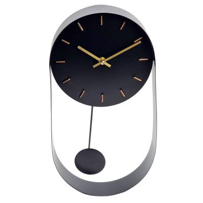 Sieninis laikrodis su švytuokle, metalinis, kiauras, juodos spalvos, valandų brūkšneliai ir rodyklės aukso spalvos, modernus stilius. Reikalingi 2vnt AA elementai - 1 laikrodžiui, 1 švytuoklei (elementai į komplektą neįeina). Matmenys: plotis - 20.5cm, storis - 5.5cm, aukštis - 39.5cm.