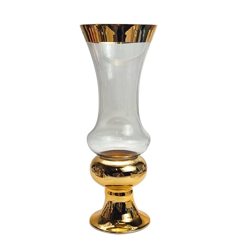 Stiklinė vaza taurės formos, pagrindas metalinis, gelsvos spalvos. Matmenys: skersmuo plačiausioje vietoje - 15cm, aukštis - 29cm.