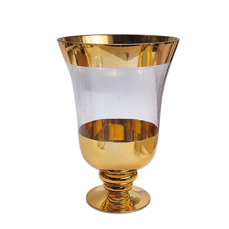 Stiklinė vaza taurės formos, pagrindas metalinis, gelsvos spalvos. Matmenys: skersmuo plačiausioje vietoje - 15cm, aukštis - 29cm.