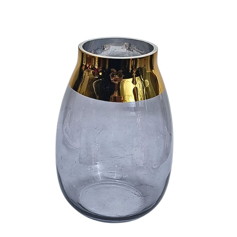 Tamsinto, pilko stiklo vaza, dekoruota aukso spalvos linija. Matmenys: skersmuo - 16cm, aukštis - 23cm.