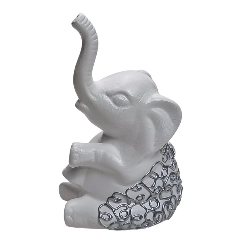 Keraminė statulėlė - sėdintis drambliukas, straublys iškeltas, baltos - sidabro spalvos. Matmenys: 6*6cm, aukštis - 11cm.
