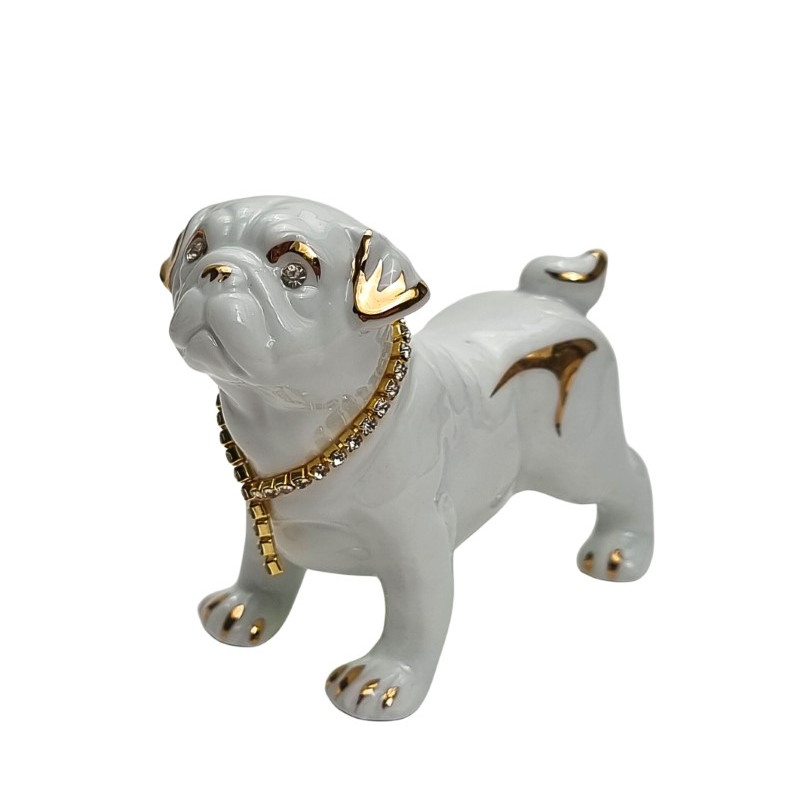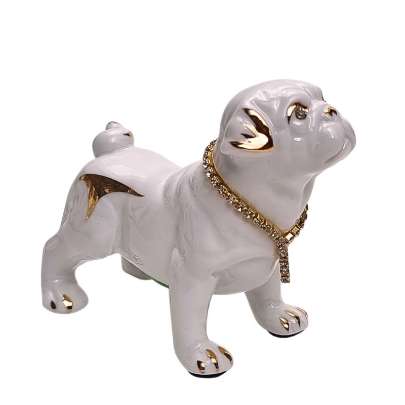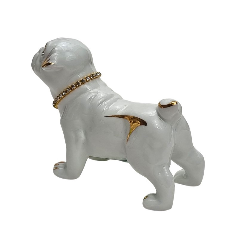 Porcelianinė statulėlė - šuniukas - Mopsas, grandinėlė. 2 spalvos. Matmenys: 12.5*6cm, aukštis - 10cm.