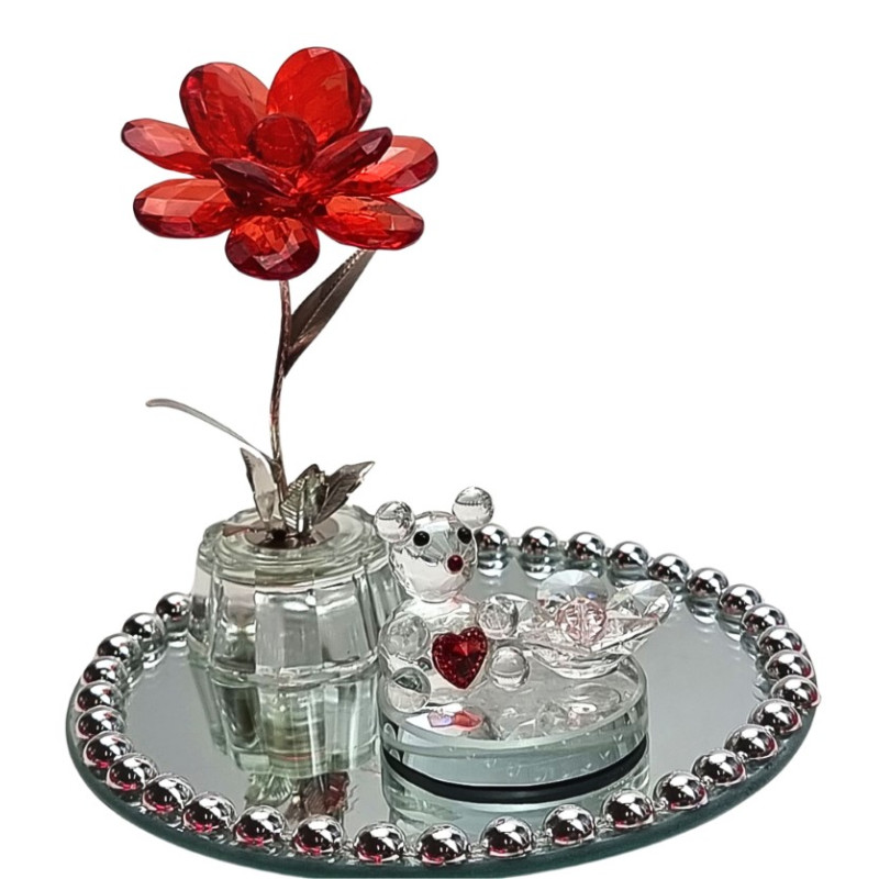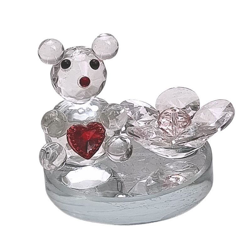 Stiklinė statulėlė - meškiukas ant pakilimo su širdele ant pilvuko, šalia gėlytė. Matmenys: 6*5cm, aukštis - 5cm.