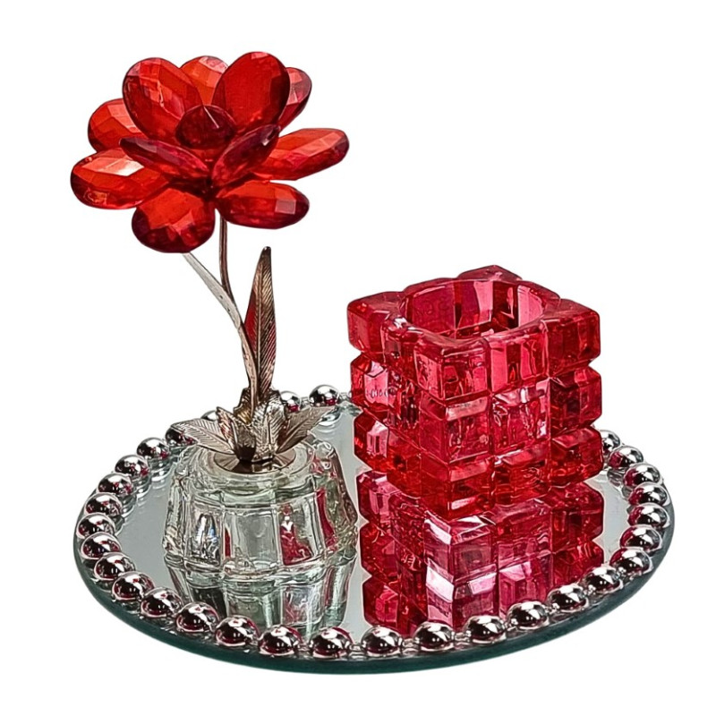 Žvakidė. Pagrindas plastikinis, sidabro spalvos, kotelis dekoruotas rože, dėklas žvakei stiklinis, matinis. Supakuota PVC dėžutėje. Matmenys: apačios skersmuo - 7cm, viršaus skersmuo - 6cm, aukštis - 15.5cm.