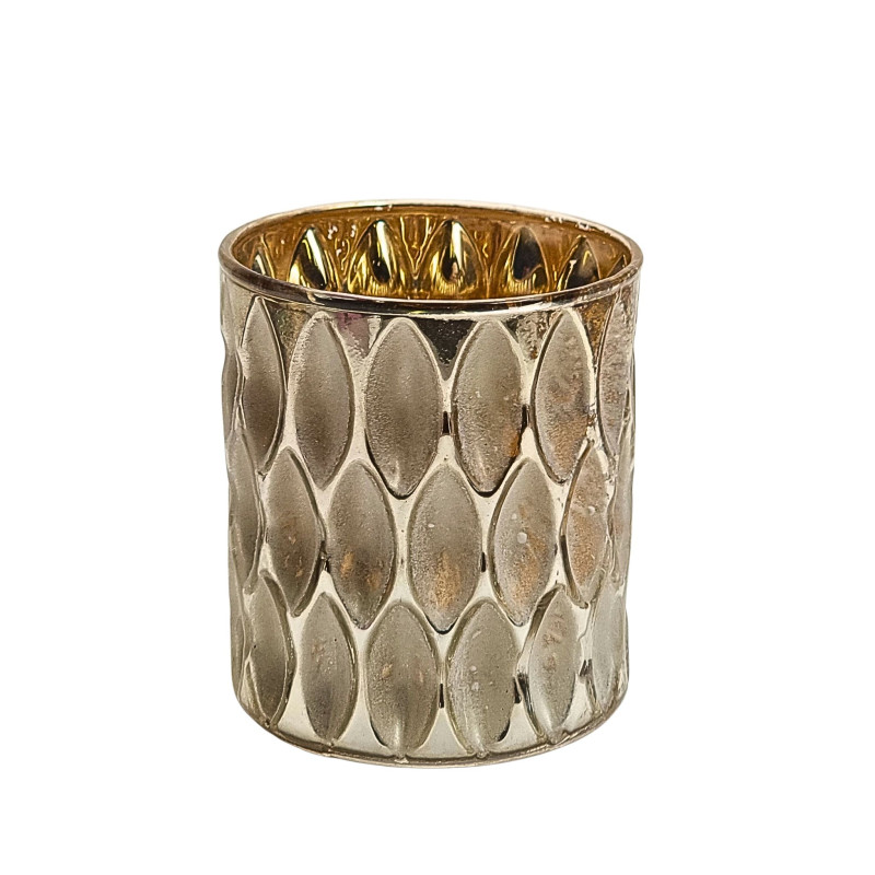 Stiklinė žvakidė, cilindro formos, išorė - rudos spalvos fonas, aukso spalvos lapai, vidus - sidabro spalvos, blizgus. Matmenys: skersmuo - 7cm, aukštis - 8cm.