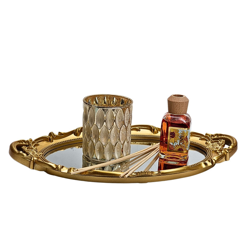 Žvakidė, apačia keraminė sendinta aukso spalvos, baroko stiliaus ornamentai, viršuje skaidrus stiklas žvakei, pritvirtintas. Matmenys: stiklo viršaus skersmuo - 12.5cm, dugno - 9.5*9.5cm, bendras aukštis - 22.5cm.
