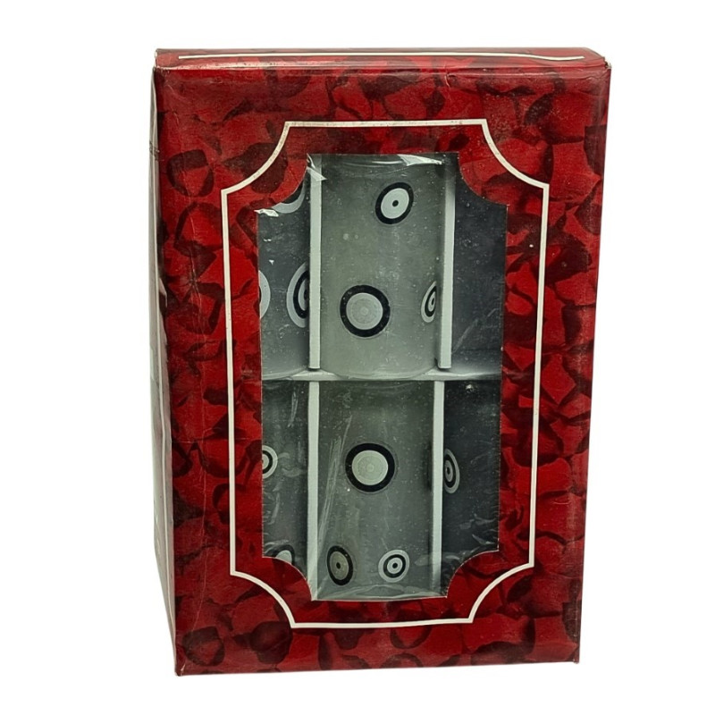 Stiklinė, lengva vazelė - žvakidė - taurė. 2 raštai. Matmenys: viršaus skersmuo - 6.8cm, apačios skersmuo - 6.5cm, aukštis - 25cm.