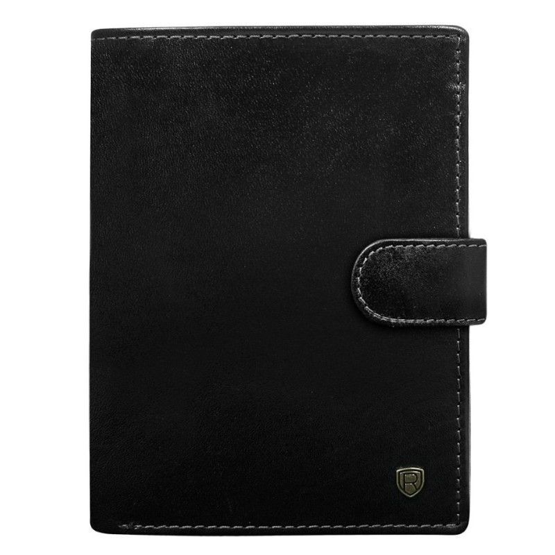 Didelė, juoda vyriška piniginė, pagaminta iš natūralios odos. Vertikalaus dizaino, be užsegimo. Turi skyrelį pinigams, užtrauktuku užsegamą skyrelį ir 13 kortelių bei asmens tapatybės kortelių skyrelių. Piniginėje taip pat telpa transporto priemonės registracijos liudijimas. Pridedama dovanų dėžutė. RFID STOP apsauga.