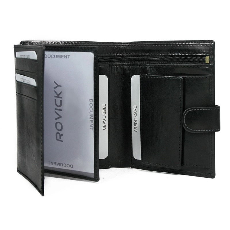 Didelė, juoda, vertikali vyriška piniginė, pagaminta iš natūralios odos. Su dideliu kortelių ir asmens dokumentų skyriumi su 15 atvartų ir dviem kišenėmis banknotams, viena iš kurių užsegama užtrauktuku. Taip pat pridedama transporto priemonės registracijos kortelė. Pridedama dovanų dėžutė ir RFID.