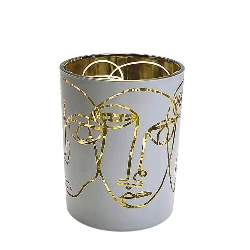 Žvakidė stiklinė cilindras veidai persišviečia vidus auksinis matinė balta. Plotis- 10cm Aukštis- 12.5cm.