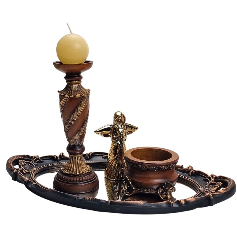Keraminė žvakidė - stovas, aukso spalvos. Matmenys: dugno - 8*8cm, viršaus skersmuo - 7.5cm, aukštis - 26cm.
